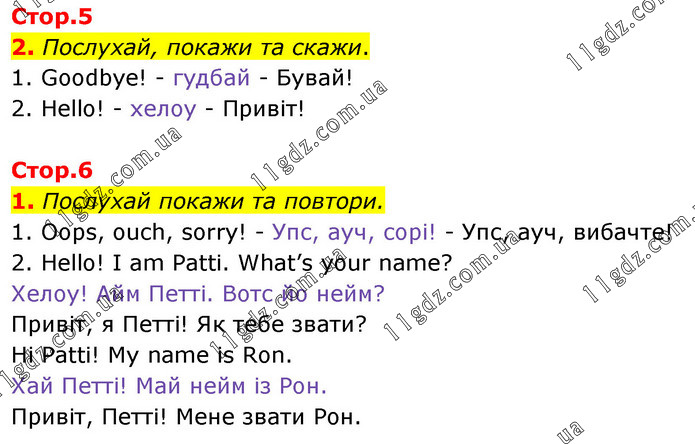 Стор.5 2. Послухай, покажи та скажи. 1. Goodbye! - гудбай - Бувай! 2. Hello! - хелоу - Привіт! Стор.6 1. Послухай покажи та повтори. 1. Oops, ouch, sorry! - Упс, ауч, сорі! - Упс, ауч, вибачте! 2. Hello! I am Patti. What’s your name? Хелоу! Айм Петті. Вотс йо нейм? Привіт, я Петті! Як тебе звати? Hi Patti! My name is Ron. Хай Петті! Май нейм із Рон. Привіт, Петті! Мене звати Рон.