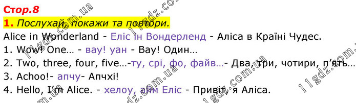 1. Послухай, покажи та повтори. Alice in Wonderland - Еліс ін Вондерленд - Аліса в Країні Чудес. 1. Wow! One… - вау! уан - Вау! Один… 2. Two, three, four, five…-ту, срі, фо, файв…- Два, три, чотири, п’ять… 3. Achoo!- апчу- Апчхі! 4. Hello, I’m Alice. - хелоу, айм Еліс - Привіт, я Аліса.