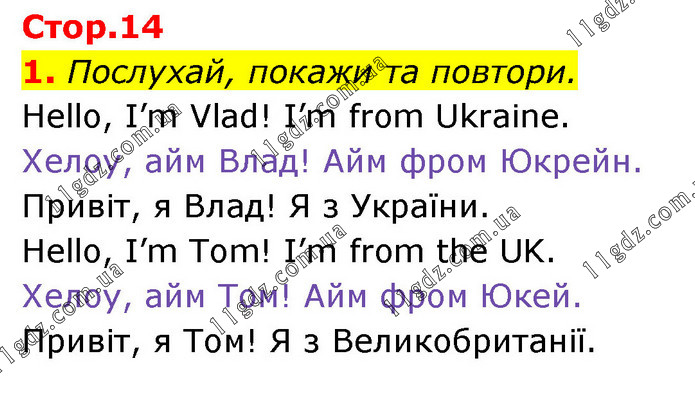1. Послухай, покажи та повтори. Hello, I’m Vlad! I’m from Ukraine. Хелоу, айм Влад! Айм фром Юкрейн. Привіт, я Влад! Я з України. Hello, I’m Tom! I’m from the UK. Хелоу, айм Том! Айм фром Юкей. Привіт, я Том! Я з Великобританії.