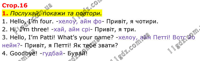 1. Послухай, покажи та повтори. 1. Hello, I’m four. -хелоу, айм фо- Привіт, я чотири. 2. Hi, I’m three! -хай, айм срі- Привіт, я три. 3. Hello, I’m Patti! What’s your name? -хелоу, айм Петті! Вотс йо нейм?- Привіт, я Петті! Як тебе звати? 4. Goodbye! -гудбай- Бувай!