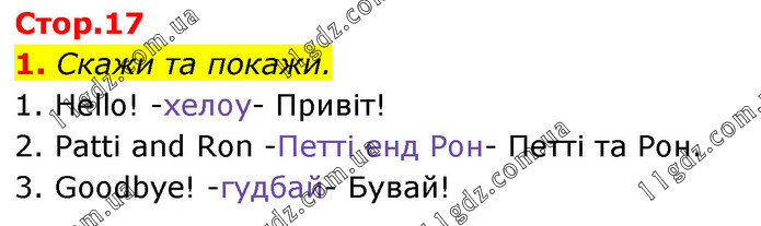 1. Скажи та покажи. 1. Hello! -хелоу- Привіт! 2. Patti and Ron -Петті енд Рон- Петті та Рон. 3. Goodbye! -гудбай- Бувай!