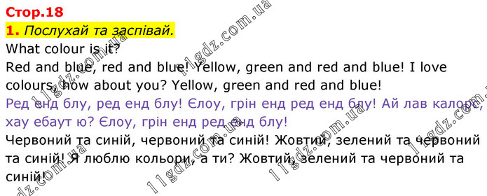 1. Послухай та заспівай. What colour is it? Red and blue, red and blue! Yellow, green and red and blue! I love colours, how about you? Yellow, green and red and blue! Ред енд блу, ред енд блу! Єлоу, грін енд ред енд блу! Ай лав калорс, хау ебаут ю? Єлоу, грін енд ред енд блу! Червоний та синій, червоний та синій! Жовтий, зелений та червоний та синій! Я люблю кольори, а ти? Жовтий, зелений та червоний та синій!