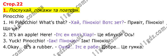 Послухай, покажи та повтори. Pinocchio 1. Hi Pinocchio! What’s that? -Хай, Пінокіо! Вотс зет?- Привіт, Пінокіо! Що це? 2. It’s an apple! Here! -Ітс ен епл! Хіар!- Це яблуко! Ось! 3. Yuck! Pinocchio! -Іак! Пінокіо!- Іак! Пінокіо! 4. Okay… It’s a rubber. - Окей… Ітс е рабе- Добре… Це гумка.
