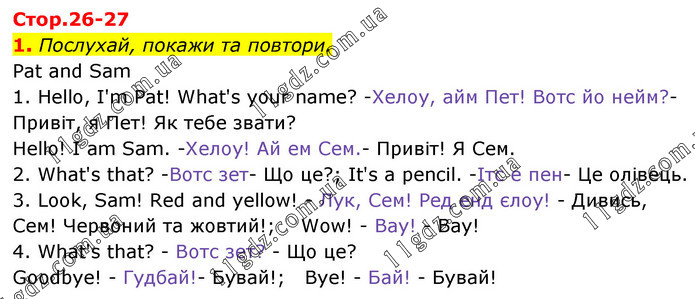 1. Послухай, покажи та повтори. Pat and Sam 1. Hello, I'm Pat! What's your name? -Хелоу, айм Пет! Вотс йо нейм?- Привіт, я Пет! Як тебе звати? Hello! I am Sam. -Хелоу! Ай ем Сем.- Привіт! Я Сем. 2. What's that? -Вотс зет- Що це?; It's a pencil. -Ітс е пен- Це олівець. 3. Look, Sam! Red and yellow! - Лук, Сем! Ред енд єлоу! - Дивись, Сем! Червоний та жовтий!; Wow! - Вау! - Вау! 4. What's that? - Вотс зет? - Що це? Goodbye! - Гудбай!- Бувай!; Bye! - Бай! - Бувай!