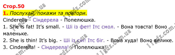 1. Послухай, покажи та повтори. Cinderella - Сіндерела - Попелюшка. 1. She is fat! It’s small. - Ші із фет! Ітс смол. - Вона товста! Воно маленьке. 2. She is thin! It’s big. - Ші із сін! Ітс біг. - Вона худа! Воно велике. 3. Cinderella! - Сіндерела! - Попелюшка!
