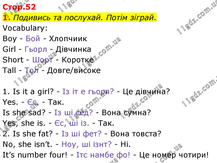 1. Подивись та послухай. Потім зіграй. Vocabulary: Boy - Бой - Хлопчиик Girl - Гьорл - Дівчинка Short - Шорт - Коротке Tall - Тол - Довге/високе 1. Is it a girl? - Із іт е гьорл? - Це дівчина? Yes. - Єс. - Так. Is she sad? - Із ші сед? - Вона сумна? Yes, she is. - Єс, ші із. - Так. 2. Is she fat? - Із ші фет? - Вона товста? No, she isn’t. - Ноу, ші ізнт? - Ні. It’s number four! - Ітс намбе фо! - Це номер чотири!