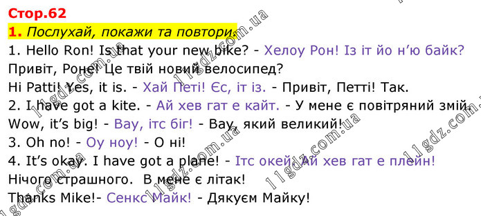 1. Послухай, покажи та повтори. 1. Hello Ron! Is that your new bike? - Хелоу Рон! Із іт йо н’ю байк? Привіт, Роне! Це твій новий велосипед? Hi Patti! Yes, it is. - Хай Петі! Єс, іт із. - Привіт, Петті! Так. 2. I have got a kite. - Ай хев гат е кайт. - У мене є повітряний змій. Wow, it’s big! - Вау, ітс біг! - Вау, який великий! 3. Oh no! - Оу ноу! - О ні! 4. It’s okay. I have got a plane! - Ітс окей. Ай хев гат е плейн! Нічого страшного. В мене є літак! Thanks Mike!- Сенкс Майк! - Дякуєм Майку!