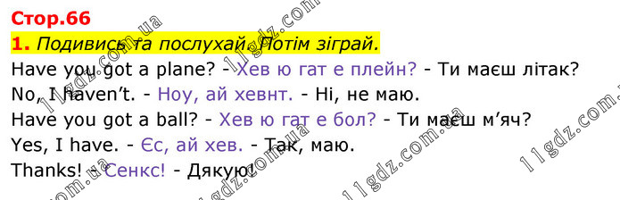 1. Подивись та послухай. Потім зіграй. Have you got a plane? - Хев ю гат е плейн? - Ти маєш літак? No, I haven’t. - Ноу, ай хевнт. - Ні, не маю. Have you got a ball? - Хев ю гат е бол? - Ти маєш м’яч? Yes, I have. - Єс, ай хев. - Так, маю. Thanks! - Сенкс! - Дякую!