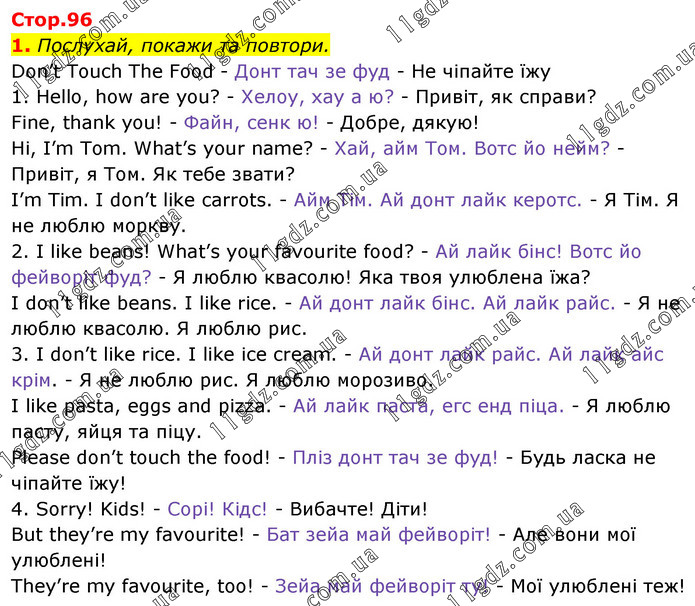 1. Послухай, покажи та повтори. Don’t Touch The Food - Донт тач зе фуд - Не чіпайте їжу 1. Hello, how are you? - Хелоу, хау а ю? - Привіт, як справи? Fine, thank you! - Файн, сенк ю! - Добре, дякую! Hi, I’m Tom. What’s your name? - Хай, айм Том. Вотс йо нейм? - Привіт, я Том. Як тебе звати? I’m Tim. I don’t like carrots. - Айм Тім. Ай донт лайк керотс. - Я Тім. Я не люблю моркву. 2. I like beans! What’s your favourite food? - Ай лайк бінс! Вотс йо фейворіт фуд? - Я люблю квасолю! Яка твоя улюблена їжа? I don’t like beans. I like rice. - Ай донт лайк бінс. Ай лайк райс. - Я не люблю квасолю. Я люблю рис. 3. I don’t like rice. I like ice cream. - Ай донт лайк райс. Ай лайк айс крім. - Я не люблю рис. Я люблю морозиво. I like pasta, eggs and pizza. - Ай лайк паста, егс енд піца. - Я люблю пасту, яйця та піцу. Please don’t touch the food! - Пліз донт тач зе фуд! - Будь ласка не чіпайте їжу! 4. Sorry! Kids! - Сорі! Кідс! - Вибачте! Діти! But they’re my favourite! - Бат зейа май фейворіт! - Але вони мої улюблені! They’re my favourite, too! - Зейа май фейворіт ту! - Мої улюблені теж!