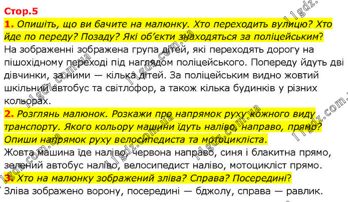 1. Опишіть, що ви бачите на малюнку. Хто переходить вулицю? Хто йде по переду? Позаду? Які об’єкти знаходяться за поліцейським? На зображенні зображена група дітей, які переходять дорогу на пішохідному переході під наглядом поліцейського. Попереду йдуть дві дівчинки, за ними — кілька дітей. За поліцейським видно жовтий шкільний автобус та світлофор, а також кілька будинків у різних кольорах. 2. Розглянь малюнок. Розкажи про напрямок руху кожного виду транспорту. Якого кольору машини їдуть наліво, направо, прямо? Опиши напрямок руху велосипедиста та мотоцикліста. Жовта машина їде наліво, червона направо, синя і блакитна прямо, зелений автобус наліво, велосипедист наліво, мотоцикліст прямо. 3. Хто на малюнку зображений зліва? Справа? Посередині? Зліва зображено ворону, посередині — бджолу, справа — равлик.