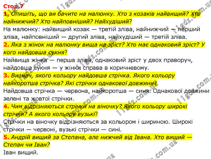 1. Опишіть, що ви бачите на малюнку. Хто з козаків найвищий? Хто найнижчий? Хто найповніший? Найхудіший? На малюнку: найвищий козак — третій зліва, найнижчий — перший зліва, найповніший — другий зліва, найхудіший — третій зліва. 2. Яка з жінок на малюнку вища на зріст? Хто має однаковий зріст? У кого найдовша сукня? Найвища жінка — перша зліва, однаковий зріст у двох праворуч, найдовша сукня — у жінки справа в коричневому. 3. Визнач, якого кольору найдовша стрічка. Якого кольору найкоротша стрічка? Які стрічки однакової довжини? Найдовша стрічка — червона, найкоротша — синя. Однакової довжини зелені та жовтої стрічки. 4. Чим відрізняються стрічки на віночку? Якого кольору широкі стрічки? А якого кольору вузькі? Стрічки на віночку відрізняються за кольором і шириною. Широкі стрічки — червоні, вузькі стрічки — сині. 5. Андрій вищий за Степана, але нижчий від Івана. Хто вищий — Степан чи Іван? Іван вищий.