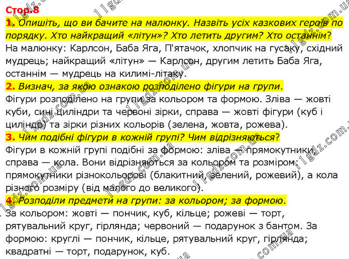 1. Опишіть, що ви бачите на малюнку. Назвіть усіх казкових героїв по порядку. Хто найкращий «літун»? Хто летить другим? Хто останнім? На малюнку: Карлсон, Баба Яга, П'ятачок, хлопчик на гусаку, східний мудрець; найкращий «літун» — Карлсон, другим летить Баба Яга, останнім — мудрець на килимі-літаку. 2. Визнач, за якою ознакою розподілено фігури на групи. Фігури розподілено на групи за кольором та формою. Зліва — жовті куби, сині циліндри та червоні зірки, справа — жовті фігури (куб і циліндр) та зірки різних кольорів (зелена, жовта, рожева). 3. Чим подібні фігури в кожній групі? Чим відрізняються? Фігури в кожній групі подібні за формою: зліва — прямокутники, справа — кола. Вони відрізняються за кольором та розміром: прямокутники різнокольорові (блакитний, зелений, рожевий), а кола різного розміру (від малого до великого). 4. Розподіли предмети на групи: за кольором; за формою. За кольором: жовті — пончик, куб, кільце; рожеві — торт, рятувальний круг, гірлянда; червоний — подарунок з бантом. За формою: круглі — пончик, кільце, рятувальний круг, гірлянда; квадратні — торт, подарунок, куб.