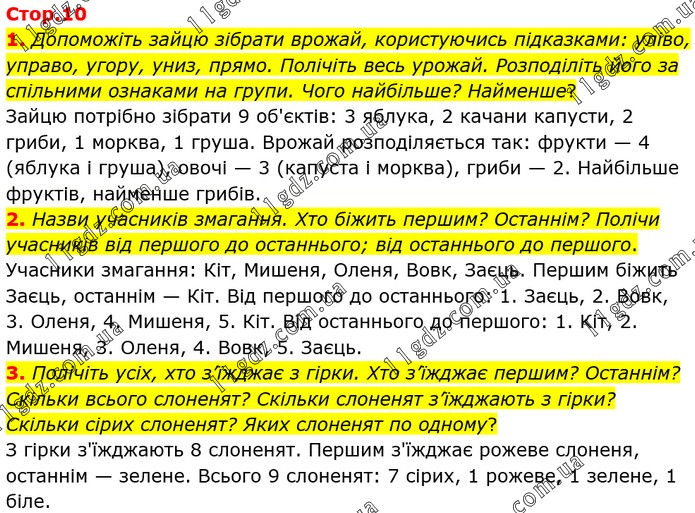 1. Допоможіть зайцю зібрати врожай, користуючись підказками: уліво, управо, угору, униз, прямо. Полічіть весь урожай. Розподіліть його за спільними ознаками на групи. Чого найбільше? Найменше? Зайцю потрібно зібрати 9 об'єктів: 3 яблука, 2 качани капусти, 2 гриби, 1 морква, 1 груша. Врожай розподіляється так: фрукти — 4 (яблука і груша), овочі — 3 (капуста і морква), гриби — 2. Найбільше фруктів, найменше грибів. 2. Назви учасників змагання. Хто біжить першим? Останнім? Полічи учасників від першого до останнього; від останнього до першого. Учасники змагання: Кіт, Мишеня, Оленя, Вовк, Заєць. Першим біжить Заєць, останнім — Кіт. Від першого до останнього: 1. Заєць, 2. Вовк, 3. Оленя, 4. Мишеня, 5. Кіт. Від останнього до першого: 1. Кіт, 2. Мишеня, 3. Оленя, 4. Вовк, 5. Заєць. 3. Полічіть усіх, хто з’їжджає з гірки. Хто з’їжджає першим? Останнім? Скільки всього слоненят? Скільки слоненят з’їжджають з гірки? Скільки сірих слоненят? Яких слоненят по одному? З гірки з'їжджають 8 слоненят. Першим з'їжджає рожеве слоненя, останнім — зелене. Всього 9 слоненят: 7 сірих, 1 рожеве, 1 зелене, 1 біле.