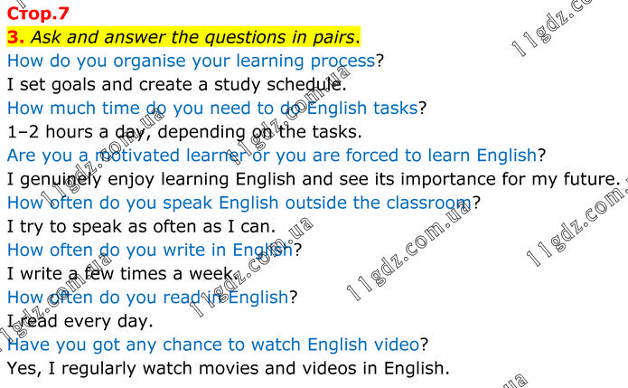 Ask and answer the questions in pairs. How do you organise your learning process? I set goals and create a study schedule. How much time do you need to do English tasks? 1–2 hours a day, depending on the tasks. Are you a motivated learner or you are forced to learn English? I genuinely enjoy learning English and see its importance for my future. How often do you speak English outside the classroom? I try to speak as often as I can. How often do you write in English? I write a few times a week. How often do you read in English? I read every day. Have you got any chance to watch English video? Yes, I regularly watch movies and videos in English.