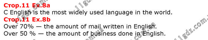 Стор.11 Ex.8a C English is the most widely used language in the world. Стор.11 Ex.8b Over 70% — the amount of mail written in English. Over 50 % — the amount of business done in English.