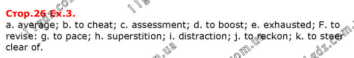 a. average; b. to cheat; c. assessment; d. to boost; e. exhausted; F. to revise: g. to pace; h. superstition; i. distraction; j. to reckon; k. to steer clear of.
