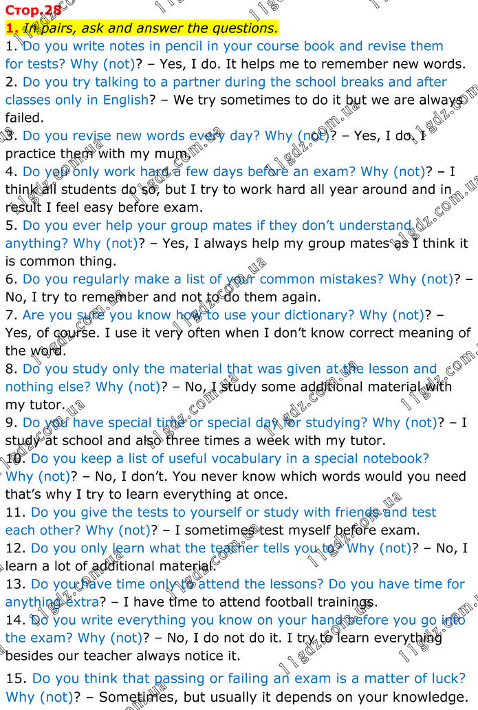 In pairs, ask and answer the questions. 1. Do you write notes in pencil in your course book and revise them for tests? Why (not)? – Yes, I do. It helps me to remember new words. 2. Do you try talking to a partner during the school breaks and after classes only in English? – We try sometimes to do it but we are always failed. 3. Do you revise new words every day? Why (not)? – Yes, I do. I practice them with my mum. 4. Do you only work hard a few days before an exam? Why (not)? – I think all students do so, but I try to work hard all year around and in result I feel easy before exam. 5. Do you ever help your group mates if they don’t understand anything? Why (not)? – Yes, I always help my group mates as I think it is common thing. 6. Do you regularly make a list of your common mistakes? Why (not)? – No, I try to remember and not to do them again. 7. Are you sure you know how to use your dictionary? Why (not)? – Yes, of course. I use it very often when I don’t know correct meaning of the word. 8. Do you study only the material that was given at the lesson and nothing else? Why (not)? – No, I study some additional material with my tutor. 9. Do you have special time or special day for studying? Why (not)? – I study at school and also three times a week with my tutor. 10. Do you keep a list of useful vocabulary in a special notebook? Why (not)? – No, I don’t. You never know which words would you need that’s why I try to learn everything at once. 11. Do you give the tests to yourself or study with friends and test each other? Why (not)? – I sometimes test myself before exam. 12. Do you only learn what the teacher tells you to? Why (not)? – No, I learn a lot of additional material. 13. Do you have time only to attend the lessons? Do you have time for anything extra? – I have time to attend football trainings. 14. Do you write everything you know on your hand before you go into the exam? Why (not)? – No, I do not do it. I try to learn everything besides our teacher always notice it. 15. Do you think that passing or failing an exam is a matter of luck? Why (not)? – Sometimes, but usually it depends on your knowledge.