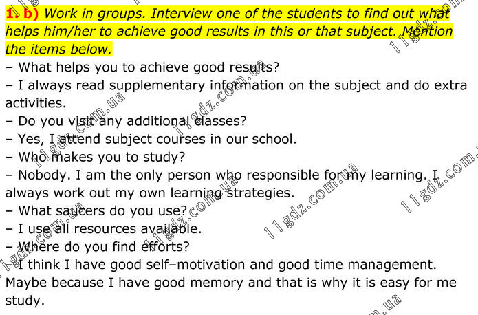 b) Work in groups. Interview one of the students to find out what helps him/her to achieve good results in this or that subject. Mention the items below. – What helps you to achieve good results? – I always read supplementary information on the subject and do extra activities. – Do you visit any additional classes? – Yes, I attend subject courses in our school. – Who makes you to study? – Nobody. I am the only person who responsible for my learning. I always work out my own learning strategies. – What saucers do you use? – I use all resources available. – Where do you find efforts? – I think I have good self–motivation and good time management. Maybe because I have good memory and that is why it is easy for me study.