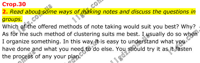Read about some ways of making notes and discuss the questions in groups. Which of the offered methods of note taking would suit you best? Why? As for me such method of clustering suits me best. I usually do so when I organize something. In this way it is easy to understand what you have done and what you need to do else. You should try it as it fasten the process of any your plan.