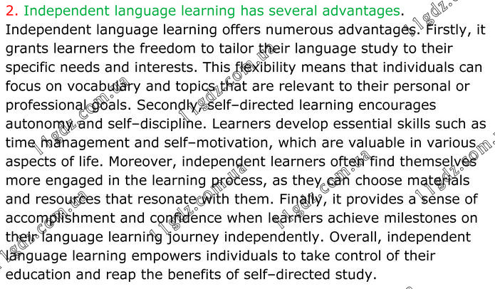 Independent language learning has several advantages. Independent language learning offers numerous advantages. Firstly, it grants learners the freedom to tailor their language study to their specific needs and interests. This flexibility means that individuals can focus on vocabulary and topics that are relevant to their personal or professional goals. Secondly, self–directed learning encourages autonomy and self–discipline. Learners develop essential skills such as time management and self–motivation, which are valuable in various aspects of life. Moreover, independent learners often find themselves more engaged in the learning process, as they can choose materials and resources that resonate with them. Finally, it provides a sense of accomplishment and confidence when learners achieve milestones on their language learning journey independently. Overall, independent language learning empowers individuals to take control of their education and reap the benefits of self–directed study.