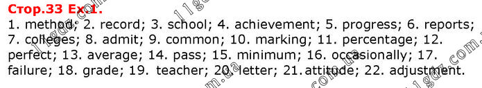 1. method; 2. record; 3. school; 4. achievement; 5. progress; 6. reports; 7. colleges; 8. admit; 9. common; 10. marking; 11. percentage; 12. perfect; 13. average; 14. pass; 15. minimum; 16. occasionally; 17. failure; 18. grade; 19. teacher; 20. letter; 21. attitude; 22. adjustment.