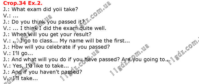 J.: What exam did yoii take? V.: ... J.: Do you think you passed it? V.: ... I think I did the exam quite well. J.: When will you get your result? V.: ... I go to class... My name will be the first... J.: How will you celebrate if you passed? V.: I’ll go... J.: And what will you do if you have passed? Are you going to... V.: Yes, I’d like to take... J.: And if you haven't passed? V.: I’ll take...