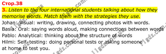 Listen to the four international students talking about how they memorise words. Match them with the strategies they use. Johan: Visual: writing, drawing, connecting photos with words. Basia: Oral: saying words aloud, making connections between words Pablo: Analytical: thinking about the structure of words Hilmi: Self–testing: doing personal tests or asking someone at home to test you.