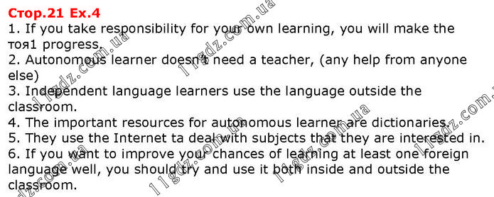 1. If you take responsibility for your own learning, you will make the тоя1 progress. 2. Autonomous learner doesn’t need a teacher, (any help from anyone else) 3. Independent language learners use the language outside the classroom. 4. The important resources for autonomous learner are dictionaries. 5. They use the Internet ta deal with subjects that they are interested in. 6. If you want to improve your chances of learning at least one foreign language well, you should try and use it both inside and outside the classroom.