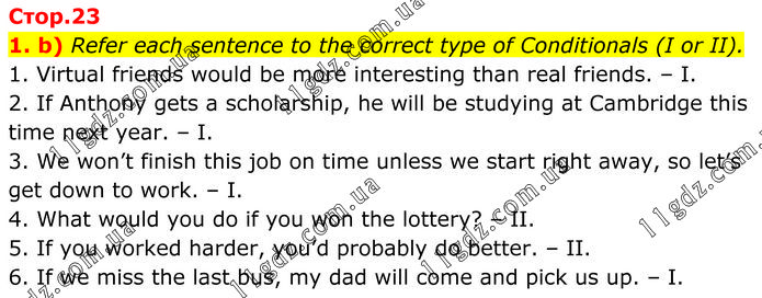 b) Refer each sentence to the correct type of Conditionals (I or II). 1. Virtual friends would be more interesting than real friends. – I. 2. If Anthony gets a scholarship, he will be studying at Cambridge this time next year. – I. 3. We won’t finish this job on time unless we start right away, so let’s get down to work. – I. 4. What would you do if you won the lottery? – II. 5. If you worked harder, you’d probably do better. – II. 6. If we miss the last bus, my dad will come and pick us up. – I.