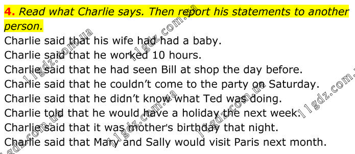 Read what Charlie says. Then report his statements to another person. Charlie said that his wife had had a baby. Charlie said that he worked 10 hours. Charlie said that he had seen Bill at shop the day before. Charlie said that he couldn’t come to the party on Saturday. Charlie said that he didn’t know what Ted was doing. Charlie told that he would have a holiday the next week. Charlie said that it was mother's birthday that night. Charlie said that Mary and Sally would visit Paris next month.