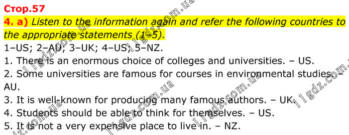 Listen to the information again and refer the following countries to the appropriate statements (1–5). 1–US; 2–AU; 3–UK; 4–US; 5–NZ. 1. There is an enormous choice of colleges and universities. – US. 2. Some universities are famous for courses in environmental studies. –AU. 3. It is well-known for producing many famous authors. – UK. 4. Students should be able to think for themselves. – US. 5. It is not a very expensive place to live in. – NZ.