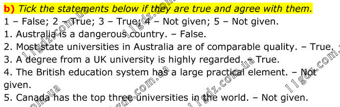 Tick the statements below if they are true and agree with them. 1 – False; 2 – True; 3 – True; 4 – Not given; 5 – Not given. 1. Australia is a dangerous country. – False. 2. Most state universities in Australia are of comparable quality. – True. 3. A degree from a UK university is highly regarded. – True. 4. The British education system has a large practical element. – Not given. 5. Canada has the top three universities in the world. – Not given.