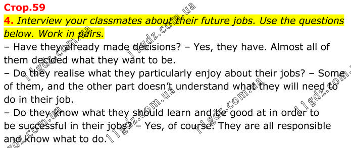 Interview your classmates about their future jobs. Use the questions below. Work in pairs. – Have they already made decisions? – Yes, they have. Almost all of them decided what they want to be. – Do they realise what they particularly enjoy about their jobs? – Some of them, and the other part doesn’t understand what they will need to do in their job. – Do they know what they should learn and be good at in order to be successful in their jobs? – Yes, of course. They are all responsible and know what to do.