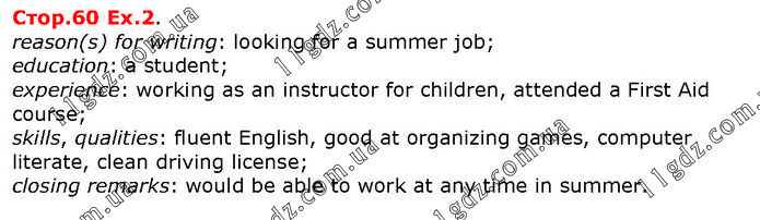 reason(s) for writing: looking for a summer job; education: a student; experience: working as an instructor for children, attended a First Aid course; skills, qualities: fluent English, good at organizing games, computer literate, clean driving license; closing remarks: would be able to work at any time in summer.