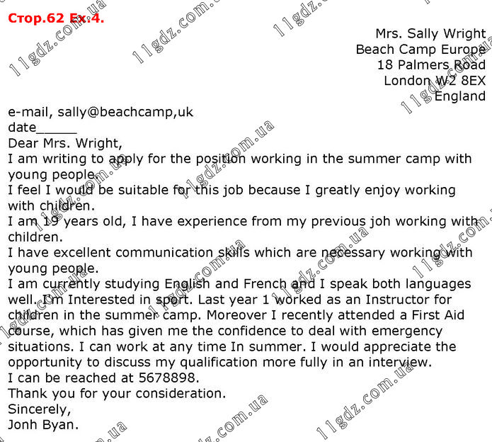 Mrs. Sally Wright Beach Camp Europe 18 Palmers Road London W2 8EX England e-mail, sally@beachcamp.uk date _ Dear Mrs. Wright, I am writing to apply for the position working in the summer camp with young people. I feel I would be suitable for this job because I greatly enjoy working with children. I am 19 years old, I have experience from my previous joh working with children. I have excellent communication skills which are necessary working with young people. I am currently studying English and French and I speak both languages well. I'm Interested in sport. Last year 1 worked as an Instructor for children in the summer camp. Moreover I recently attended a First Aid course, which has given me the confidence to deal with emergency situations. I can work at any time In summer. I would appreciate the opportunity to discuss my qualification more fully in an interview. I can be reached at 5678898. Thank you for your consideration. Sincerely, Jonh Byan.