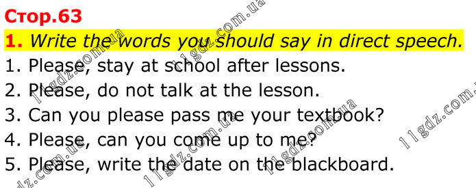 Write the words you should say in direct speech. 1. Please, stay at school after lessons. 2. Please, do not talk at the lesson. 3. Can you please pass me your textbook? 4. Please, can you come up to me? 5. Please, write the date on the blackboard.