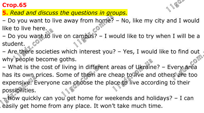 Read and discuss the questions in groups. – Do you want to live away from home? – No, like my city and I would like to live here. – Do you want to live on campus? – I would like to try when I will be a student. – Are there societies which interest you? – Yes, I would like to find out why people become goths. – What is the cost of living in different areas of Ukraine? – Every area has its own prices. Some of them are cheap to live and others are too expensive. Everyone can choose the place to live according to their possibilities. – How quickly can you get home for weekends and holidays? – I can easily get home from any place. It won’t take much time.