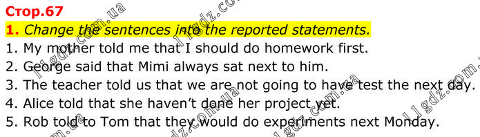 Change the sentences into the reported statements. 1. My mother told me that I should do homework first. 2. George said that Mimi always sat next to him. 3. The teacher told us that we are not going to have test the next day. 4. Alice told that she haven’t done her project yet. 5. Rob told to Tom that they would do experiments next Monday.