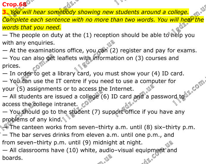 You will hear somebody showing new students around a college. Complete each sentence with no more than two words. You will hear the words that you need. — The people on duty at the (1) reception should be able to help you with any enquiries. — At the examinations office, you can (2) register and pay for exams. — You can also get leaflets with information on (3) courses and prices. — In order to get a library card, you must show your (4) ID card. — You can use the IT centre if you need to use a computer for your (5) assignments or to access the Internet. — All students are issued a college (6) ID card and a password to access the college intranet. — You should go to the student (7) support office if you have any problems of any kind. — The canteen works from seven–thirty a.m. until (8) six–thirty p.m. — The bar serves drinks from eleven a.m. until one p.m., and from seven–thirty p.m. until (9) midnight at night. — All classrooms have (10) white, audio–visual equipment and boards.