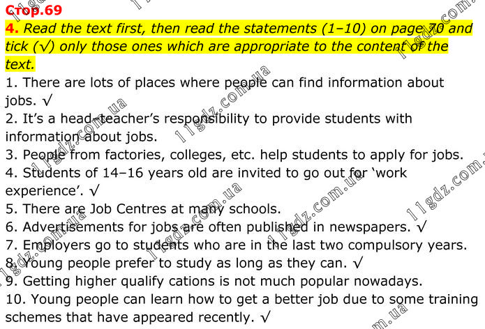 Read the text first, then read the statements (1–10) on page 70 and tick (√) only those ones which are appropriate to the content of the text. 1. There are lots of places where people can find information about jobs. √ 2. It’s a head–teacher’s responsibility to provide students with information about jobs. 3. People from factories, colleges, etc. help students to apply for jobs. 4. Students of 14–16 years old are invited to go out for ‘work experience’. √ 5. There are Job Centres at many schools. 6. Advertisements for jobs are often published in newspapers. √ 7. Employers go to students who are in the last two compulsory years. 8. Young people prefer to study as long as they can. √ 9. Getting higher qualify cations is not much popular nowadays. 10. Young people can learn how to get a better job due to some training schemes that have appeared recently. √