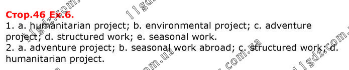 1. a. humanitarian project; b. environmental project; c. adventure project; d. structured work; e. seasonal work. 2. a. adventure project; b. seasonal work abroad; c. structured work; d. humanitarian project.