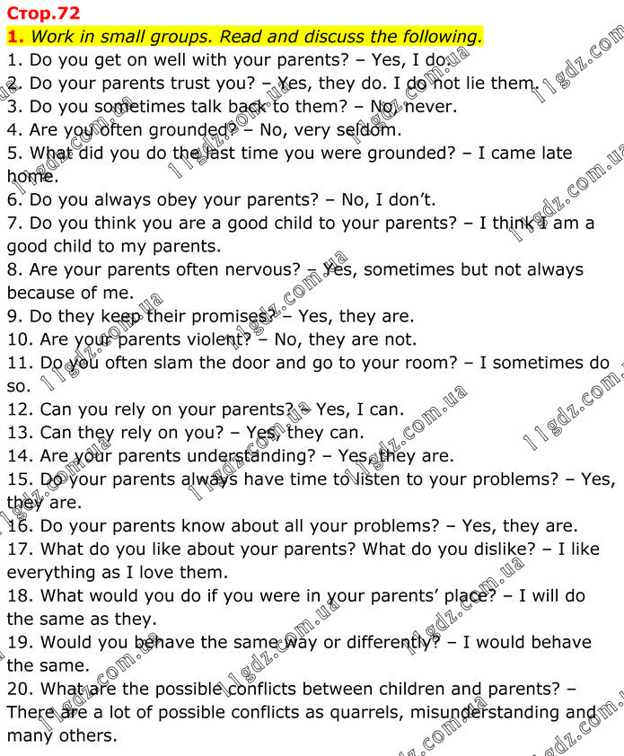 Work in small groups. Read and discuss the following. 1. Do you get on well with your parents? – Yes, I do. 2. Do your parents trust you? – Yes, they do. I do not lie them. 3. Do you sometimes talk back to them? – No, never. 4. Are you often grounded? – No, very seldom. 5. What did you do the last time you were grounded? – I came late home. 6. Do you always obey your parents? – No, I don’t. 7. Do you think you are a good child to your parents? – I think I am a good child to my parents. 8. Are your parents often nervous? – Yes, sometimes but not always because of me. 9. Do they keep their promises? – Yes, they are. 10. Are your parents violent? – No, they are not. 11. Do you often slam the door and go to your room? – I sometimes do so. 12. Can you rely on your parents? – Yes, I can. 13. Can they rely on you? – Yes, they can. 14. Are your parents understanding? – Yes, they are. 15. Do your parents always have time to listen to your problems? – Yes, they are. 16. Do your parents know about all your problems? – Yes, they are. 17. What do you like about your parents? What do you dislike? – I like everything as I love them. 18. What would you do if you were in your parents’ place? – I will do the same as they. 19. Would you behave the same way or differently? – I would behave the same. 20. What are the possible conflicts between children and parents? – There are a lot of possible conflicts as quarrels, misunderstanding and many others.