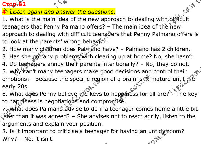 Listen again and answer the questions. 1. What is the main idea of the new approach to dealing with difficult teenagers that Penny Palmano offers? – The main idea of the new approach to dealing with difficult teenagers that Penny Palmano offers is to look at the parents’ wrong behavior. 2. How many children does Palmano have? – Palmano has 2 children. 3. Has she got any problems with clearing up at home? No, she hasn’t. 4. Do teenagers annoy their parents intentionally? – No, they do not. 5. Why can’t many teenagers make good decisions and control their emotions? –Because the specific region of a brain isn’t mature until the early 20s. 6. What does Penny believe the keys to happiness for all are? – The key to happiness is negotiations and compromise. 7. What does Palmano advise to do if a teenager comes home a little bit later than it was agreed? – She advises not to react agrily, listen to the arguments and explain your position. 8. Is it important to criticise a teenager for having an untidy room? Why? – No, it isn’t.