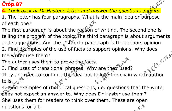 Look back at Dr Haster’s letter and answer the questions in pairs. 1. The letter has four paragraphs. What is the main idea or purpose of each one? The first paragraph is about the reason of writing. The second one is telling the problem of the topic. The third paragraph is about arguments and suggestions. And the last forth paragraph is the authors opinion. 2. Find examples of the use of facts to support opinions. Why does the writer use them? The author uses them to prove the facts. 3. Find uses of transitional phrases. Why are they used? They are used to continue the idea not to lose the chain which author tells. 4. Find examples of rhetorical questions, i.e. questions that the writer does not expect an answer to. Why does Dr Haster use them? She uses them for readers to think over them. These are open questions for all.