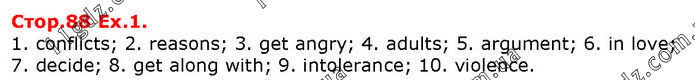 1. conflicts; 2. reasons; 3. get angry; 4. adults; 5. argument; 6. in love; 7. decide; 8. get along with; 9. intolerance; 10. violence