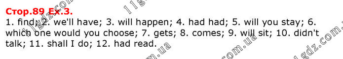 1. find; 2. we'll have; 3. will happen; 4. had had; 5. will you stay; 6. which one would you choose; 7. gets; 8. comes; 9. will sit; 10. didn't talk; 11. shall I do; 12. had read.