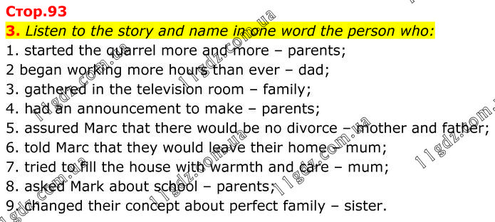 Listen to the story and name in one word the person who: 1. started the quarrel more and more – parents; 2 began working more hours than ever – dad; 3. gathered in the television room – family; 4. had an announcement to make – parents; 5. assured Marc that there would be no divorce – mother and father; 6. told Marc that they would leave their home – mum; 7. tried to fill the house with warmth and care – mum; 8. asked Mark about school – parents; 9. changed their concept about perfect family – sister.
