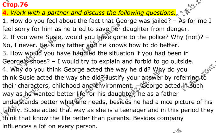 Work with a partner and discuss the following questions. 1. How do you feel about the fact that George was jailed? – As for me I feel sorry for him as he tried to save her daughter from danger. 2. If you were Susie, would you have gone to the police? Why (not)? – No, I never. He is my father and he knows how to do better. 3. How would you have handled the situation if you had been in George’s shoes? – I would try to explain and forbid to go outside. 4. Why do you think George acted the way he did? Why do you think Susie acted the way she did? Justify your answer by referring to their characters, childhood and environment. – George acted in such way as he wanted better life for his daughter, he as a father understands better what she needs, besides he had a nice picture of his family. Susie acted that way as she is a teenager and in this period they think that know the life better than parents. Besides company influences a lot on every person.