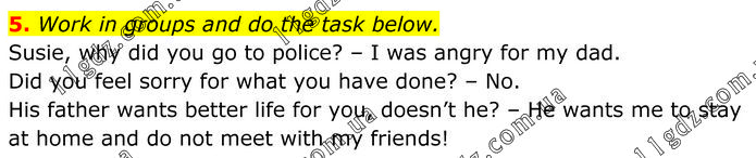 Work in groups and do the task below. Susie, why did you go to police? – I was angry for my dad. Did you feel sorry for what you have done? – No. His father wants better life for you, doesn’t he? – He wants me to stay at home and do not meet with my friends!