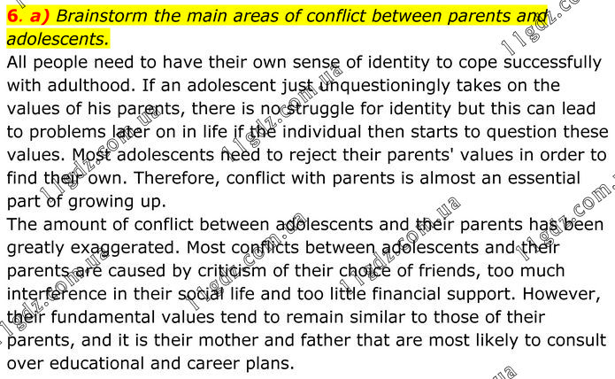 a) Brainstorm the main areas of conflict between parents and adolescents. All people need to have their own sense of identity to cope successfully with adulthood. If an adolescent just unquestioningly takes on the values of his parents, there is no struggle for identity but this can lead to problems later on in life if the individual then starts to question these values. Most adolescents need to reject their parents' values in order to find their own. Therefore, conflict with parents is almost an essential part of growing up. The amount of conflict between adolescents and their parents has been greatly exaggerated. Most conflicts between adolescents and their parents are caused by criticism of their choice of friends, too much interference in their social life and too little financial support. However, their fundamental values tend to remain similar to those of their parents, and it is their mother and father that are most likely to consult over educational and career plans.